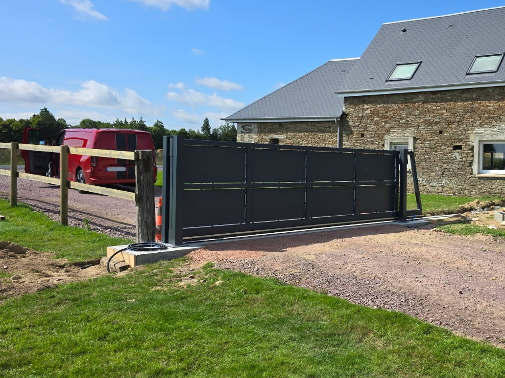 - Portail fabriqué sur mesure pour couvrir une ouverture large et s’adapter aux contraintes du terrain et de circulation.